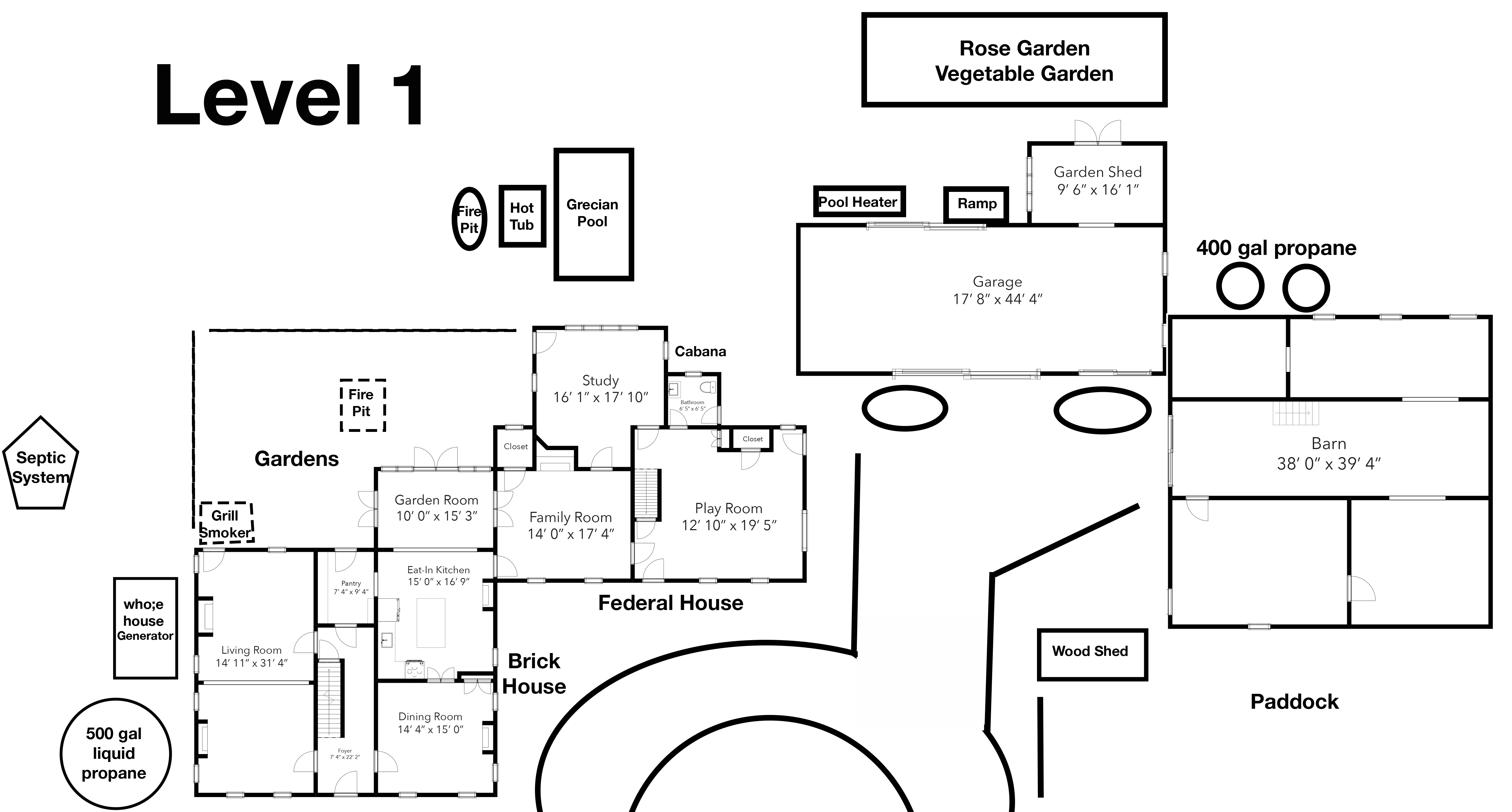 FloorPlans Level 1 comprises the downstairs living spaces Brick 1817 rooms are left, 1720 rooms in the middle,outbuilding garage&barn to the right