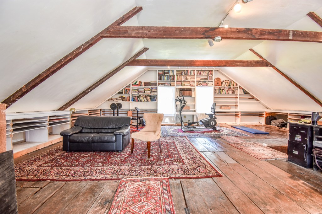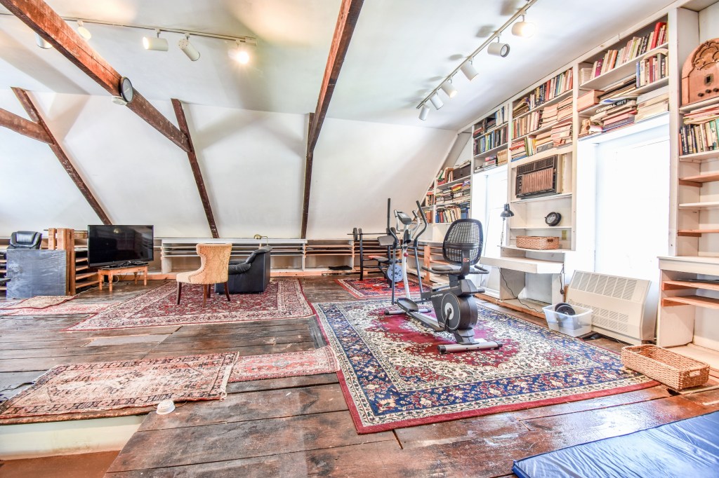 Level 3 is a multi-functional 900 sq open footprint room with vaulted, hand hewn beamed ceiling and track lighting. The wide pine floors are original and offer a warm ambiance in combination with the wrap around credenza shelving and floor to ceiling library shelves